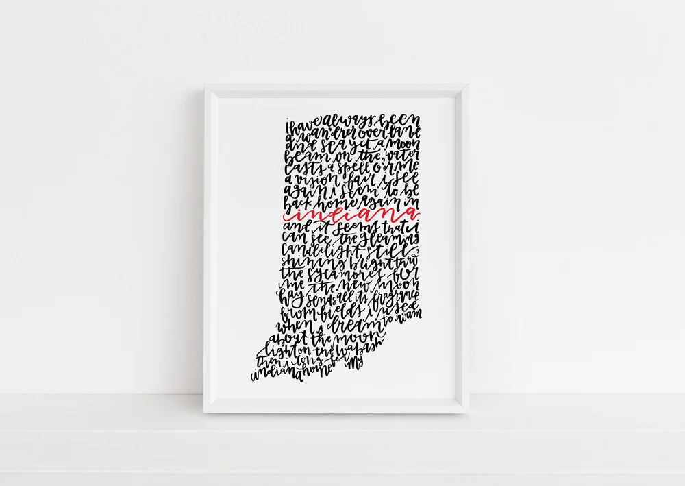 Back Home Again In Indiana Calligraphy Illustration Print Hoopla Letters